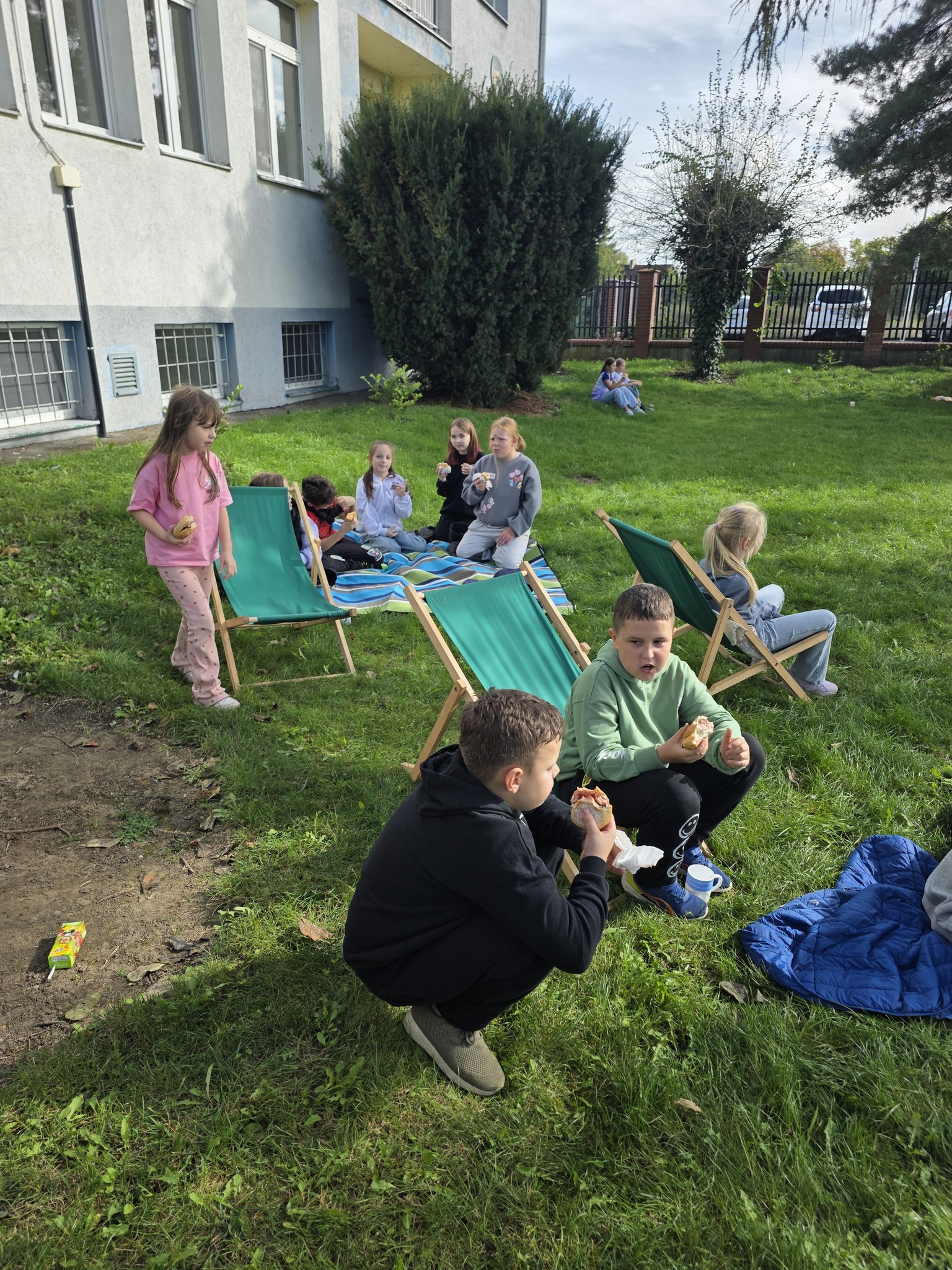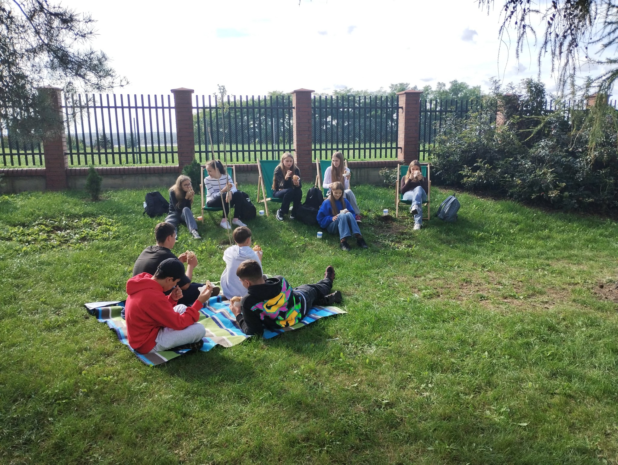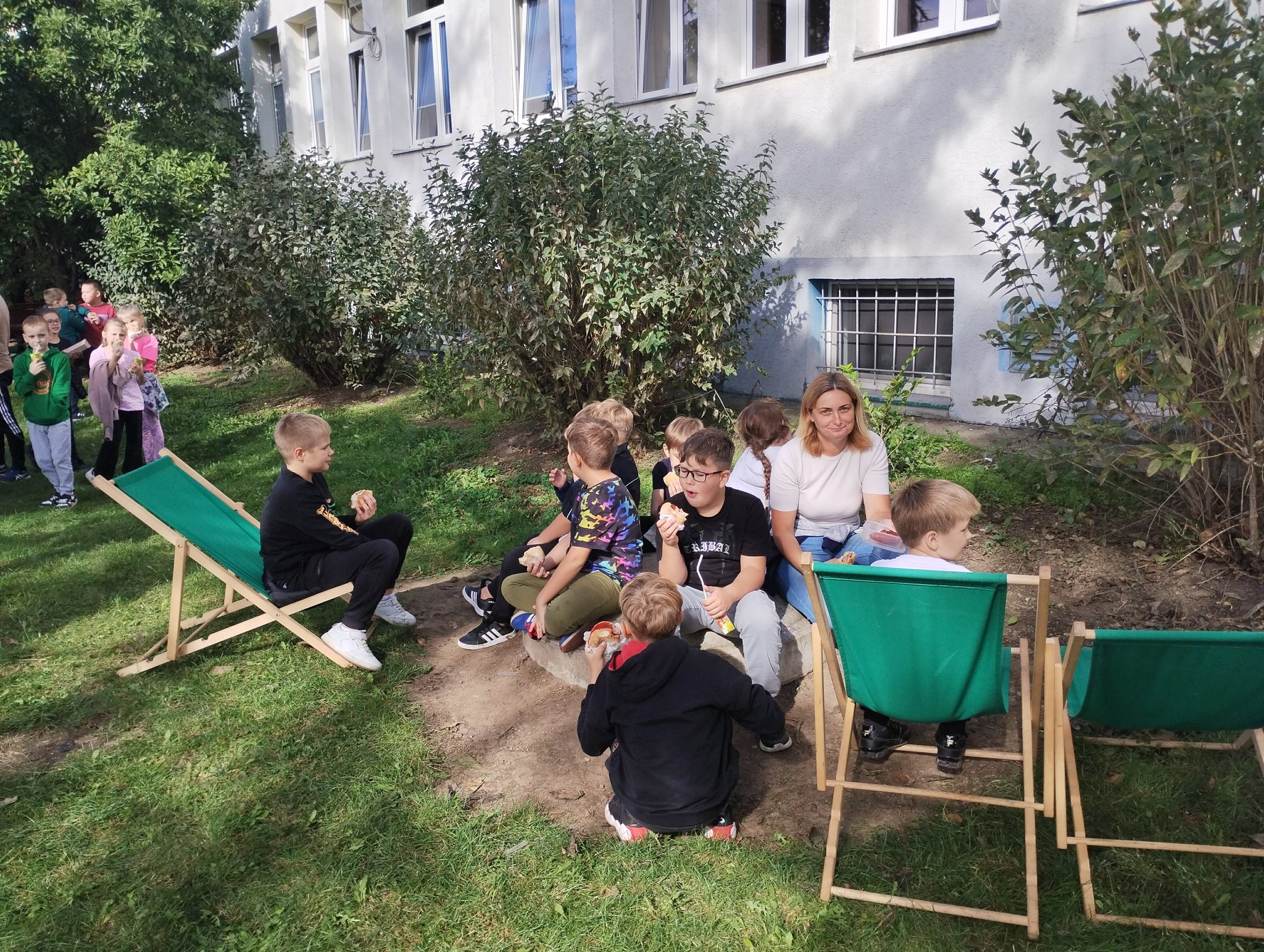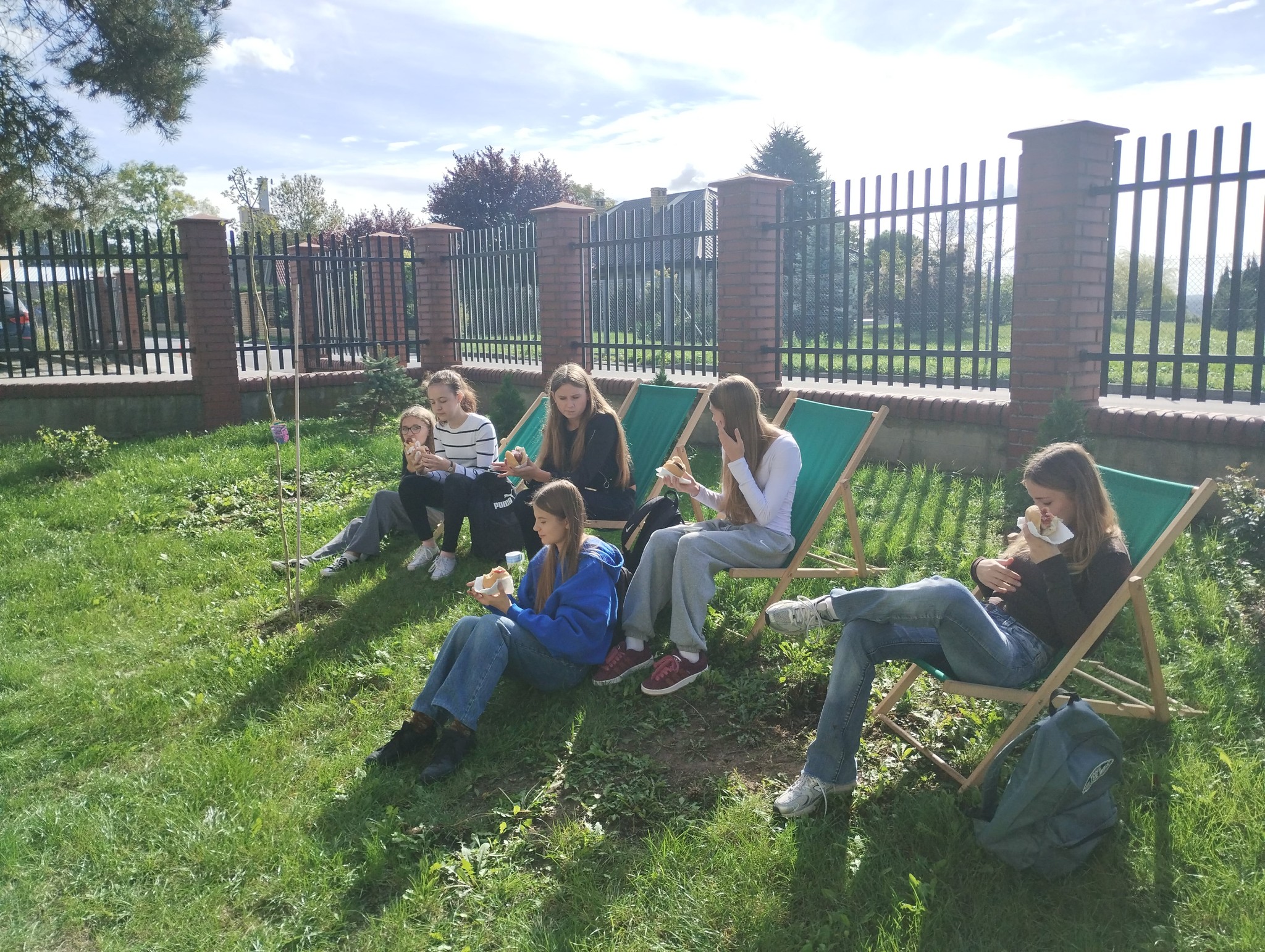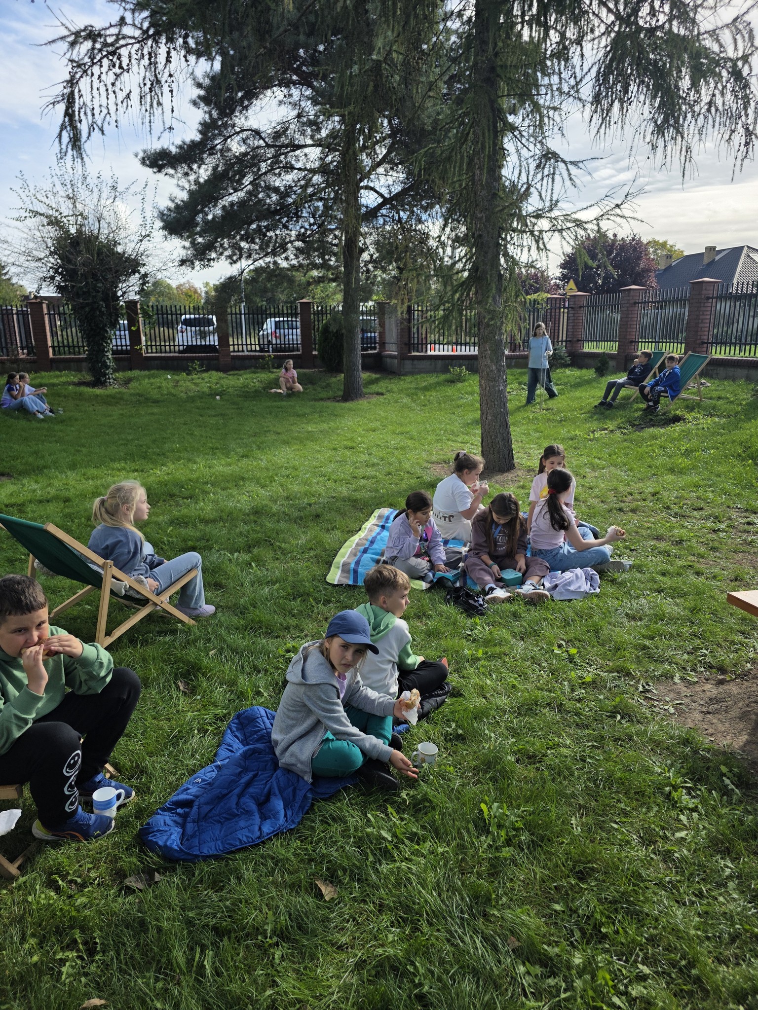Po zakończonej pracy na uczestników czekał w szkolnym ogrodzie poczęstunek. Piękna, słoneczna pogoda sprzyjała wspólnemu odpoczynkowi na kocach i leżakach, a spotkanie stało się także okazją do symbolicznego powitania pierwszego dnia jesieni.