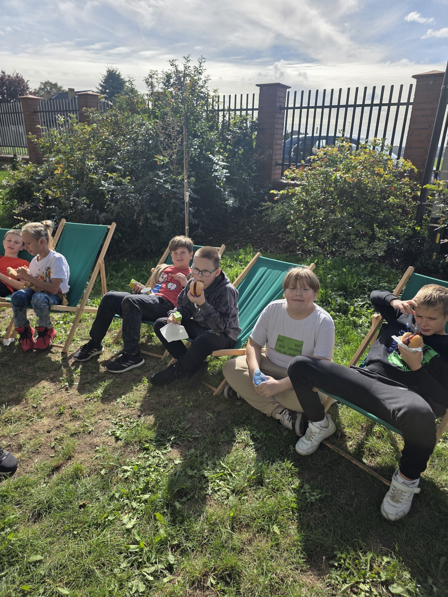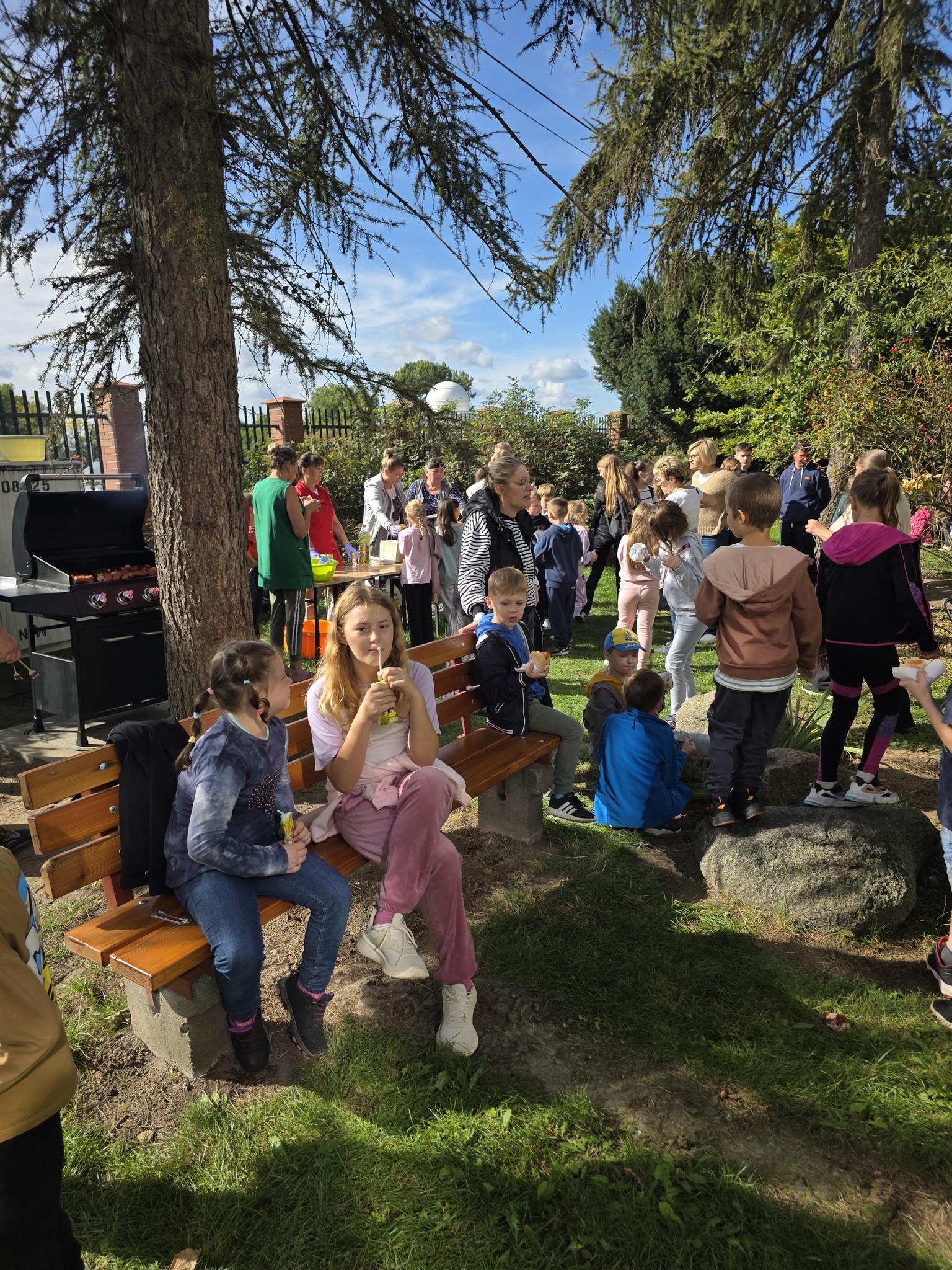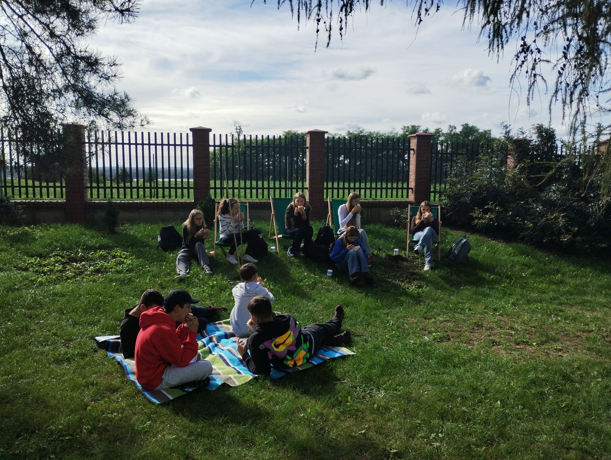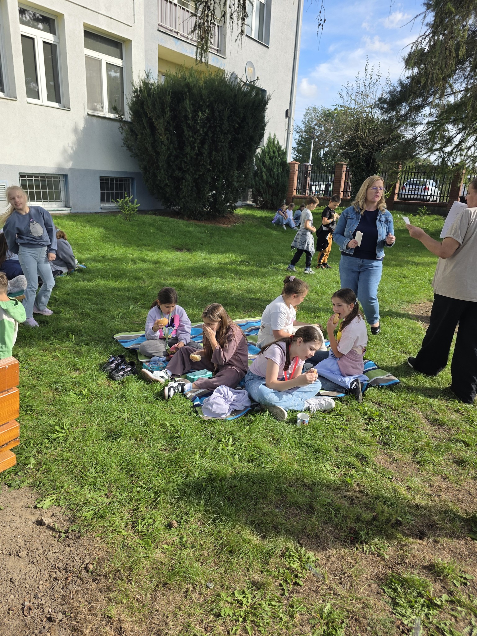 Po zakończonej pracy na uczestników czekał w szkolnym ogrodzie poczęstunek. Piękna, słoneczna pogoda sprzyjała wspólnemu odpoczynkowi na kocach i leżakach, a spotkanie stało się także okazją do symbolicznego powitania pierwszego dnia jesieni.