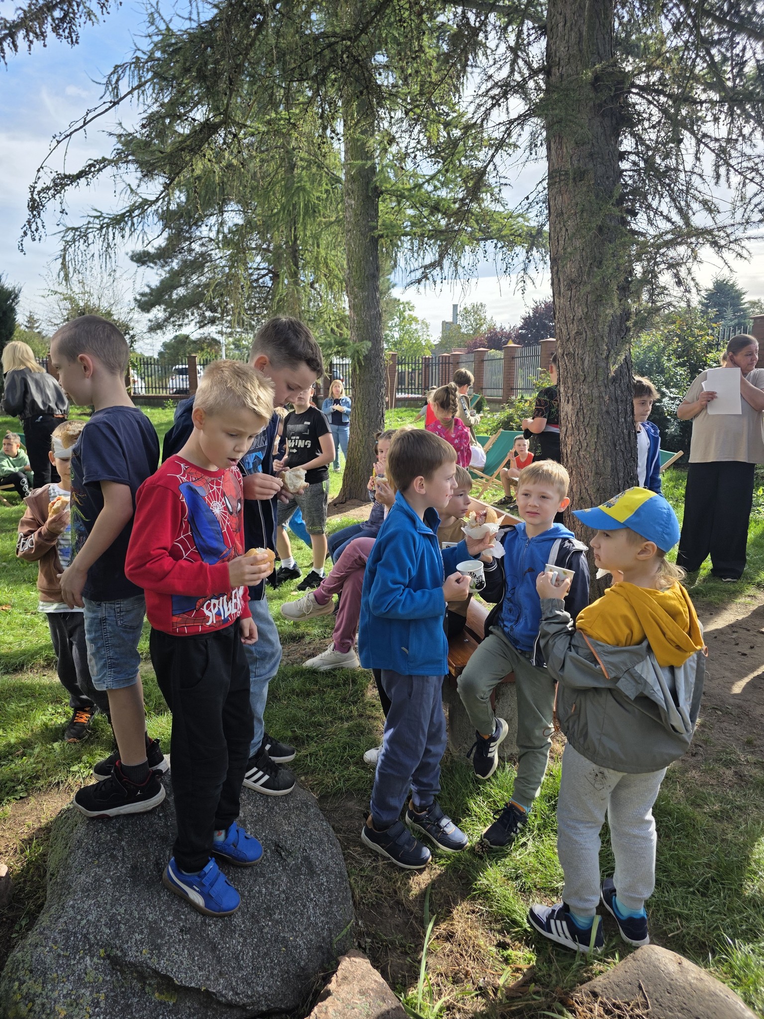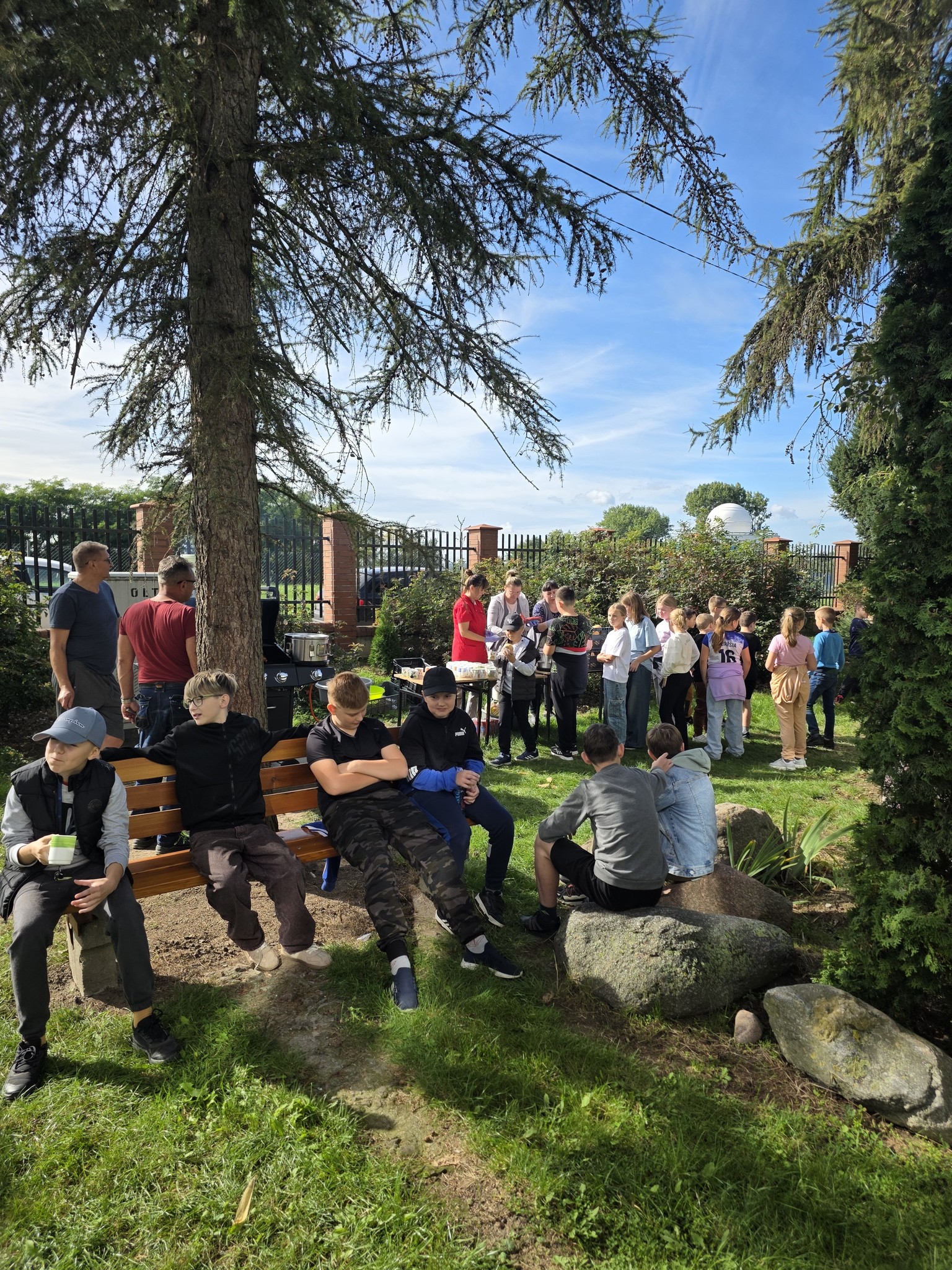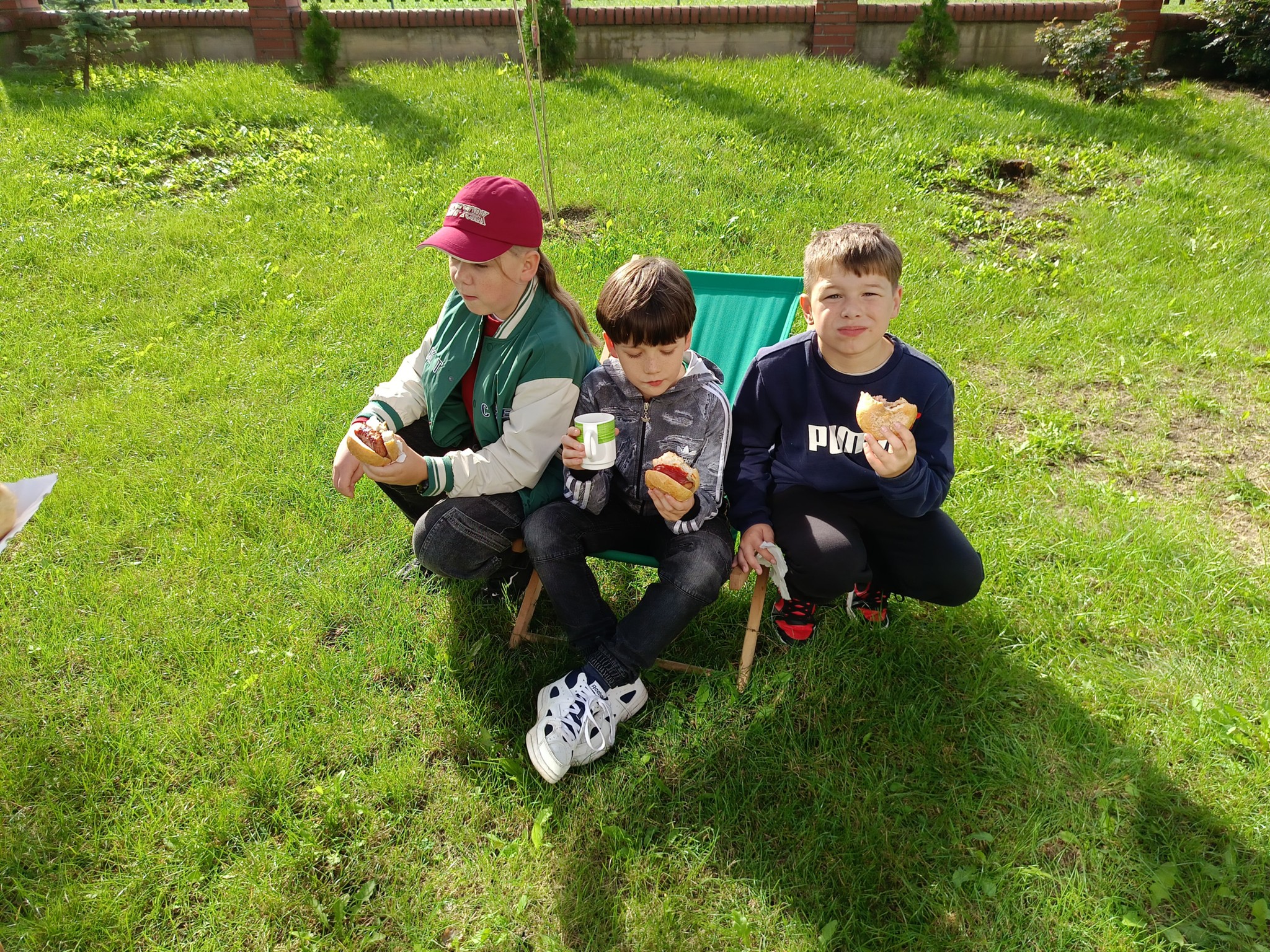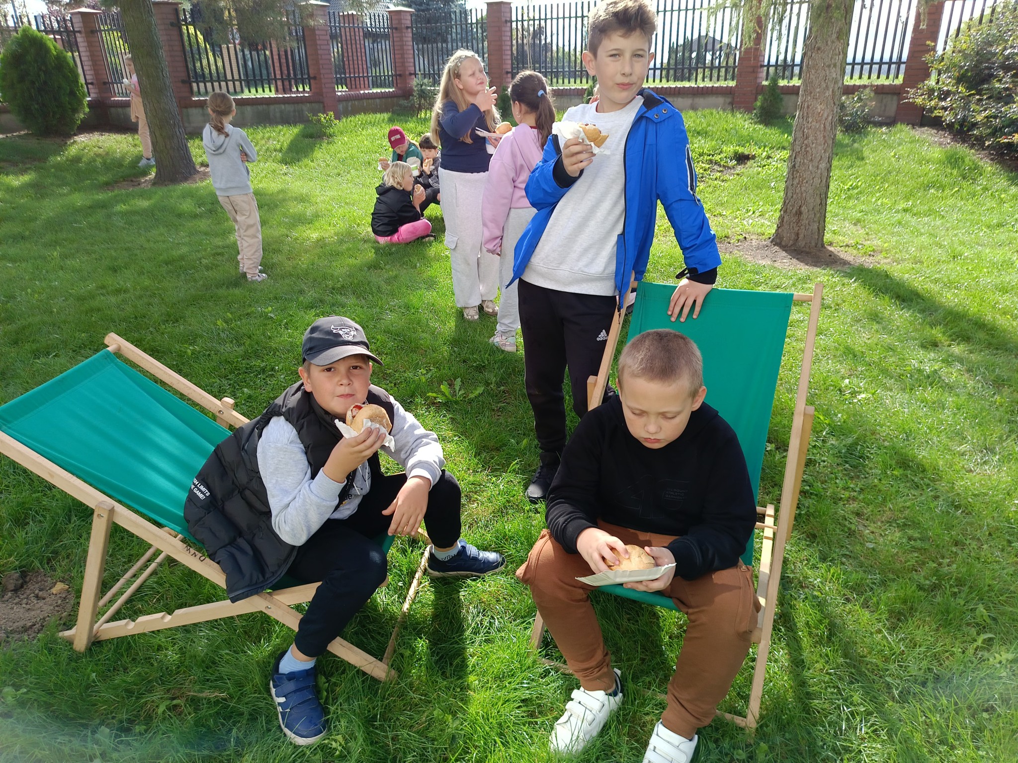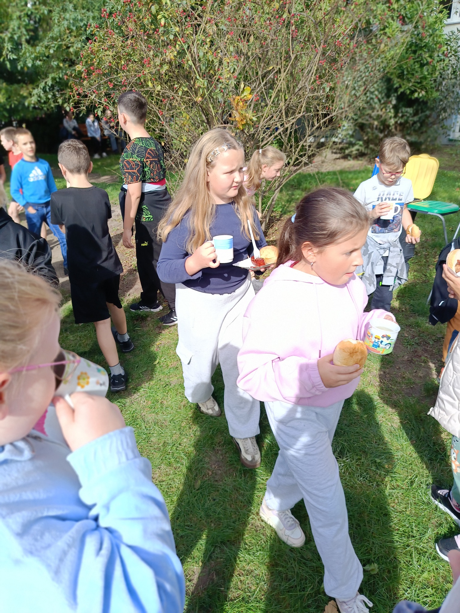 Po zakończonej pracy na uczestników czekał w szkolnym ogrodzie poczęstunek. Piękna, słoneczna pogoda sprzyjała wspólnemu odpoczynkowi na kocach i leżakach, a spotkanie stało się także okazją do symbolicznego powitania pierwszego dnia jesieni.