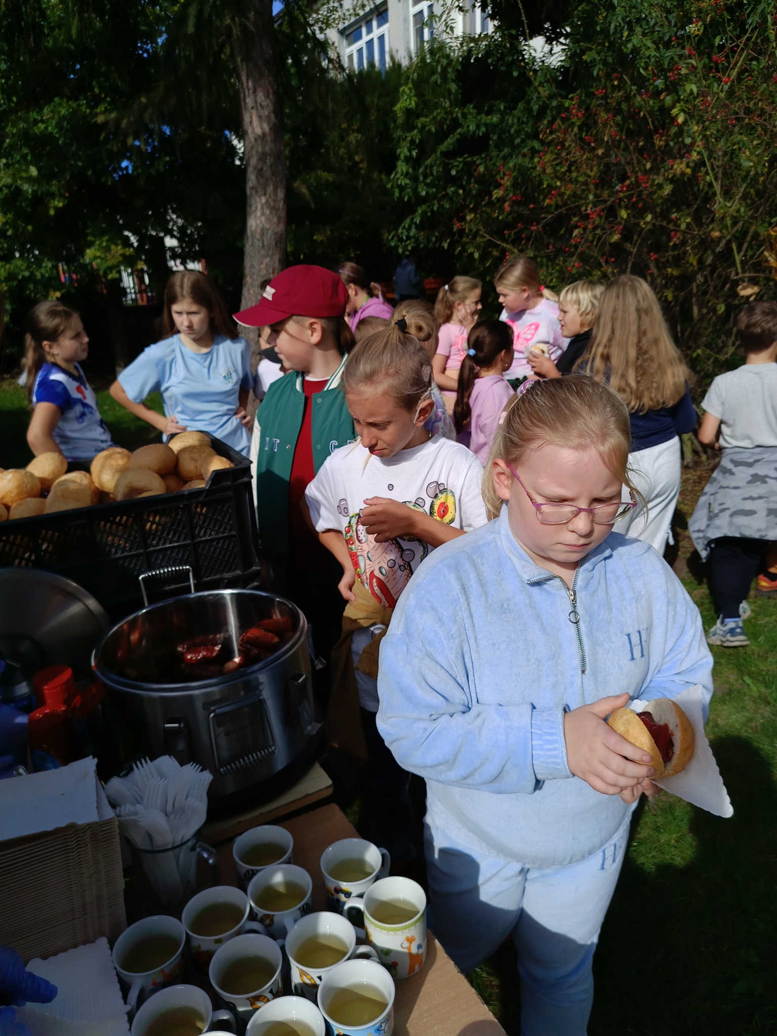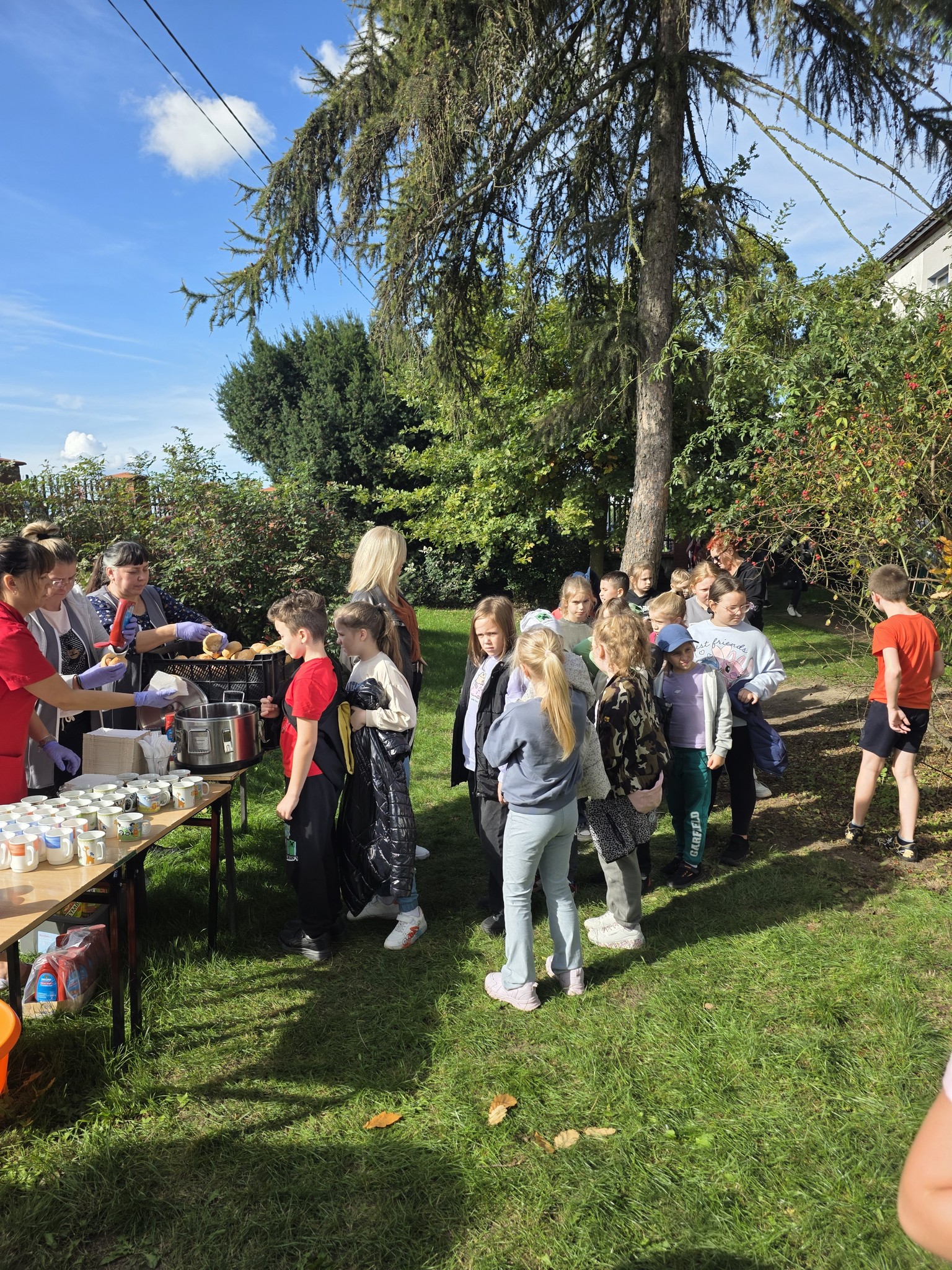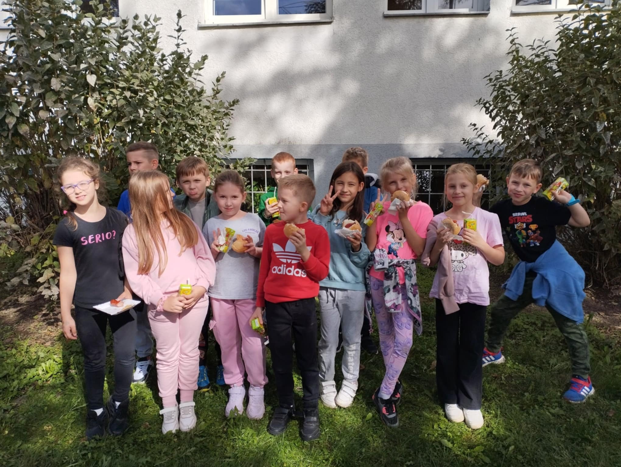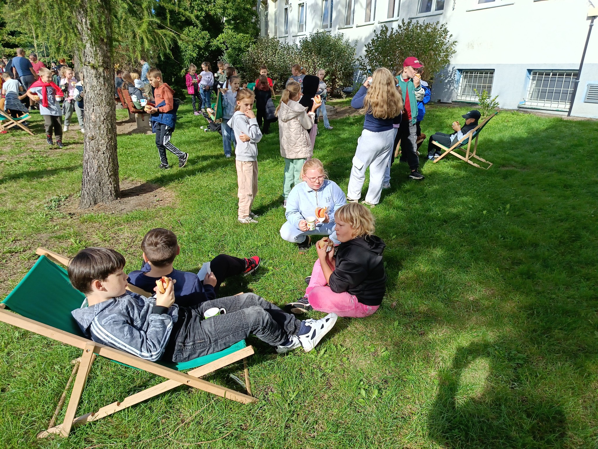 Po zakończonej pracy na uczestników czekał w szkolnym ogrodzie poczęstunek. Piękna, słoneczna pogoda sprzyjała wspólnemu odpoczynkowi na kocach i leżakach, a spotkanie stało się także okazją do symbolicznego powitania pierwszego dnia jesieni.