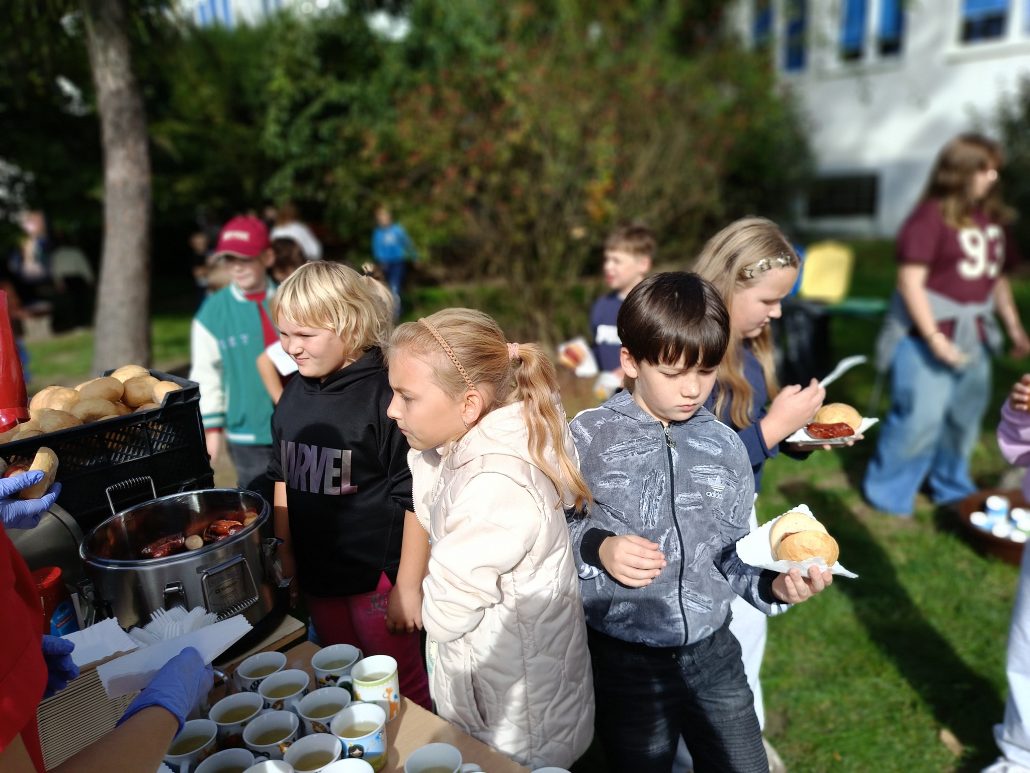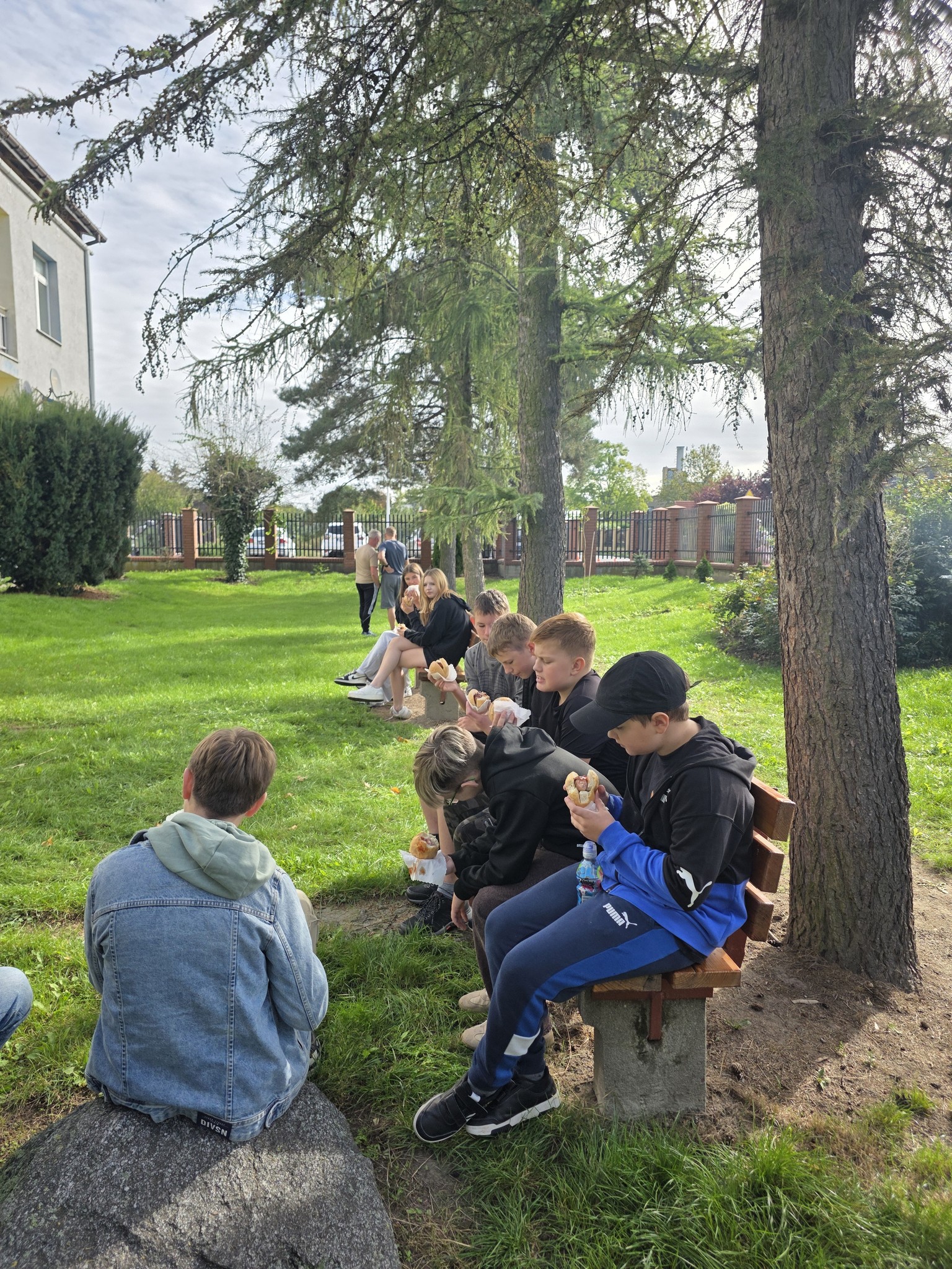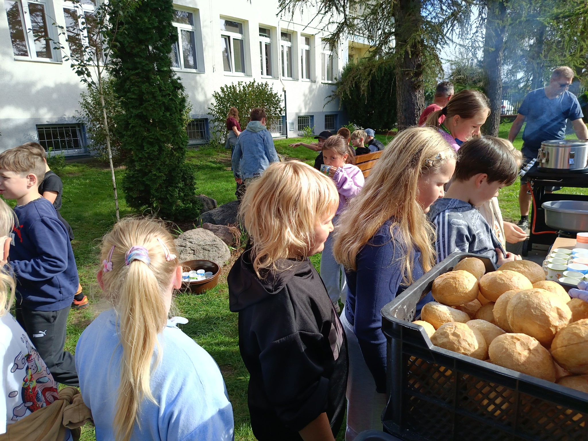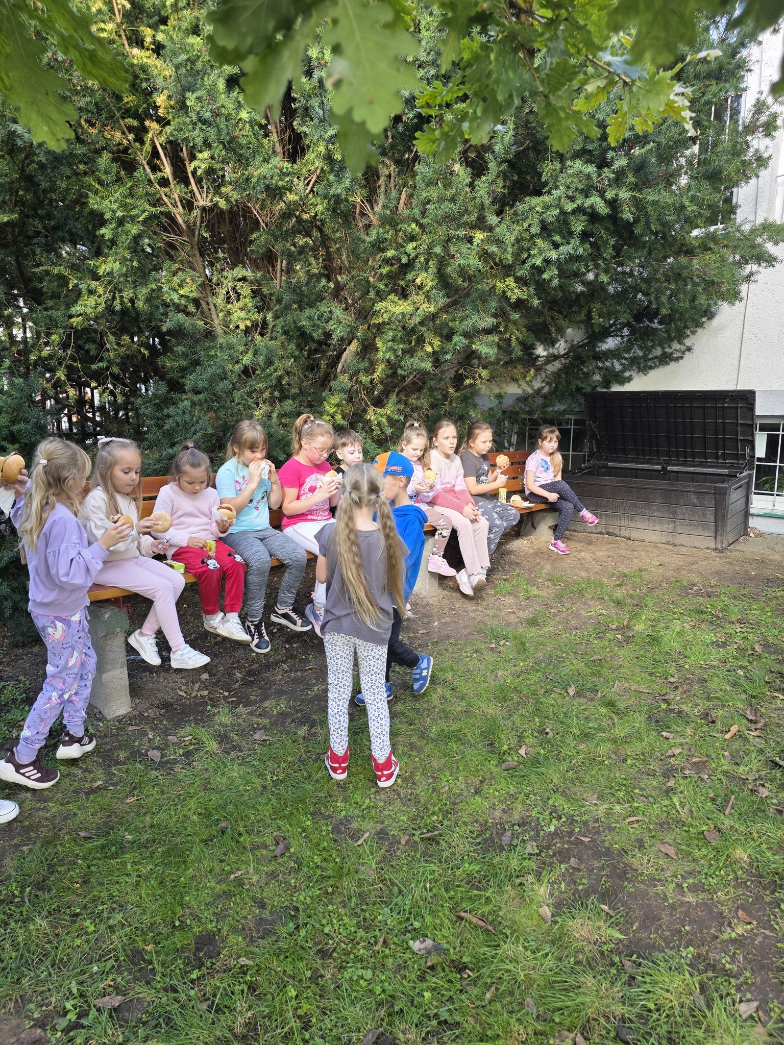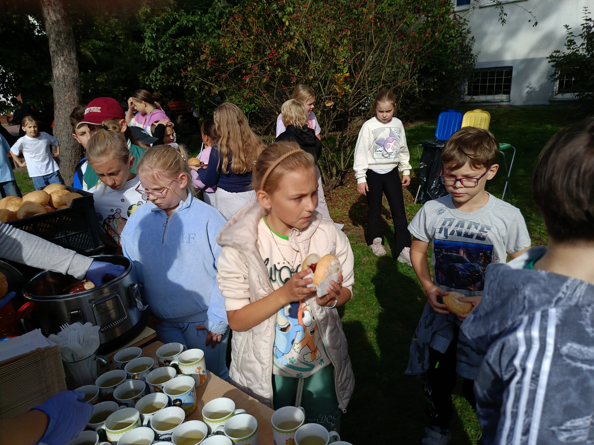 Po zakończonej pracy na uczestników czekał w szkolnym ogrodzie poczęstunek. Piękna, słoneczna pogoda sprzyjała wspólnemu odpoczynkowi na kocach i leżakach, a spotkanie stało się także okazją do symbolicznego powitania pierwszego dnia jesieni.